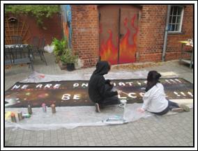 Inhaltlich sollten die Kinder und Jugendlichen sich überlegen, welche Slogans/Aussagen benutzt werden sollen, wie die Transparente künstlerisch gestaltet werden könnten. Sie mussten dafür verschiedene Techniken ausprobieren und entstandene Skizzen umzusetzen.